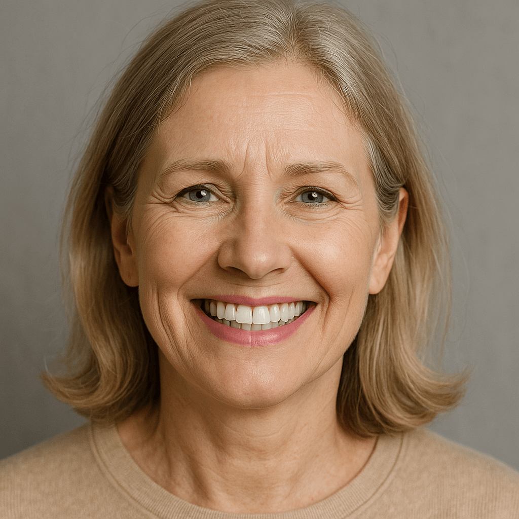 After: A combination of in-office whitening for her natural teeth and porcelain veneers on the front gave her a bright, balanced, and natural smile — perfect for family photos again.
