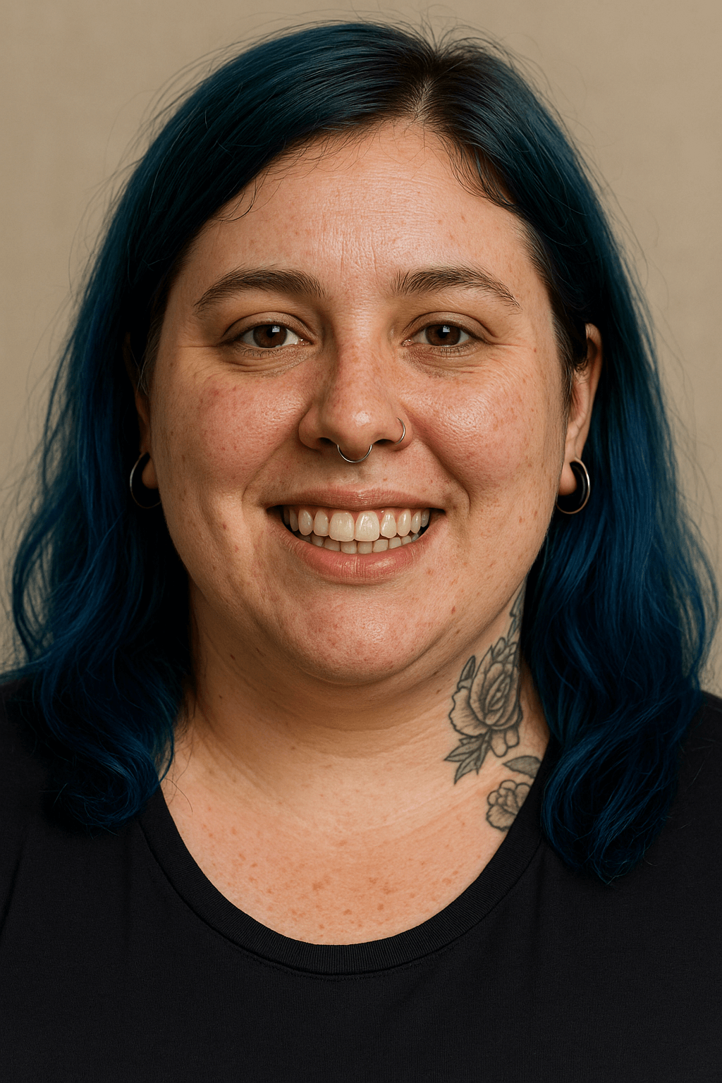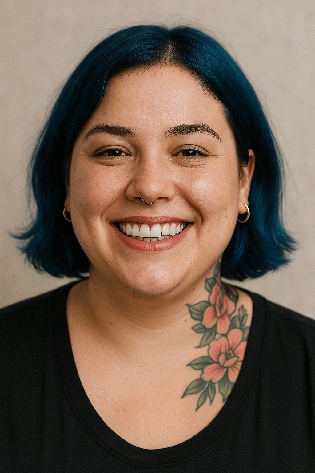 After: Composite bonding and professional whitening gave her a vibrant, genuine smile that reflects her creative personality.